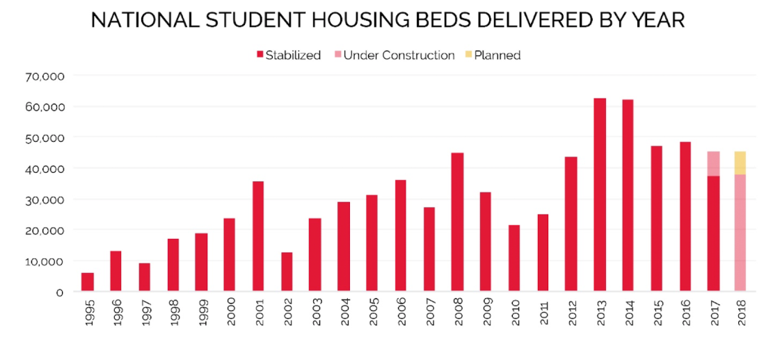 Meanwhile, on the supply side, across the entire US, a shortage of beds remains. Axiometrics, a RealPage company that collects and analyzes privately owned student housing data across major universities nationwide, pointed out that more than 37,000 beds were delivered in 2017, with 8,000 more in the pipeline, or anticipated to be delivered soon. Though this might seem like a large number, supply continues to lag demand, as it has done since the recession.