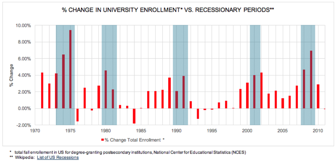 During the past decade, the student housing sector has garnered the attention of REITs, pension fund and other large investors who point to the data showing lower rental rate volatility than traditional apartments. The chart below shows that university enrollment in the US tends to grow at a faster pace during recessionary periods, than during non-recessionary periods. While it is important to note that the increase in undergraduate enrollment rate does not automatically translate to an increase in demand for student housing at the same rate, student enrollment remains one of the most important factors that drives the student housing demand. Even so, it is critical to recognize that each student housing property is unique with supply and demand fundamentals that may not follow national trends.